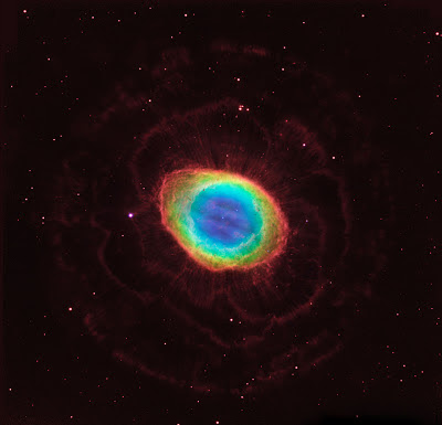 A estrela que está na origem desta lindíssima Nebulosa do Anel tinha uma massa que era bastantes vezes maior do que a do Sol. Quando esta estrela chegou perto do fim da sua vida, ela inchou, tornando-se no que os astrónomos chamam "gigante vermelha". No seu processo de dilatação, a gigante vermelha lançou para o espaço os gases que tinha nas suas camadas mais exteriores. Quando o seu processo de fusão nuclear começou a abrandar, por se estar a esgotar totalmente o seu hidrogénio, a estrela contraiu-se, tornando-se no que se chama "anã branca". Esta anã branca, que está a consumir os seus últimos vestígios de hidrogénio, é o ponto branco que se vê no meio do azul do "olho".