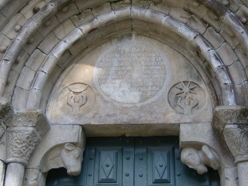 Abre o viajante por sua mão a igreja, mas antes reencontrou o Sol e a Lua românicos, e o boi interrogativo em grande conversa com uma figura humana que, com a mão no queixo, se vê mesmo que não sabe responder. Por cima e aos lados, arquivoltas e colunelos são góticos, e a grande rosácea, bela e atrevida no seu lançamento.
