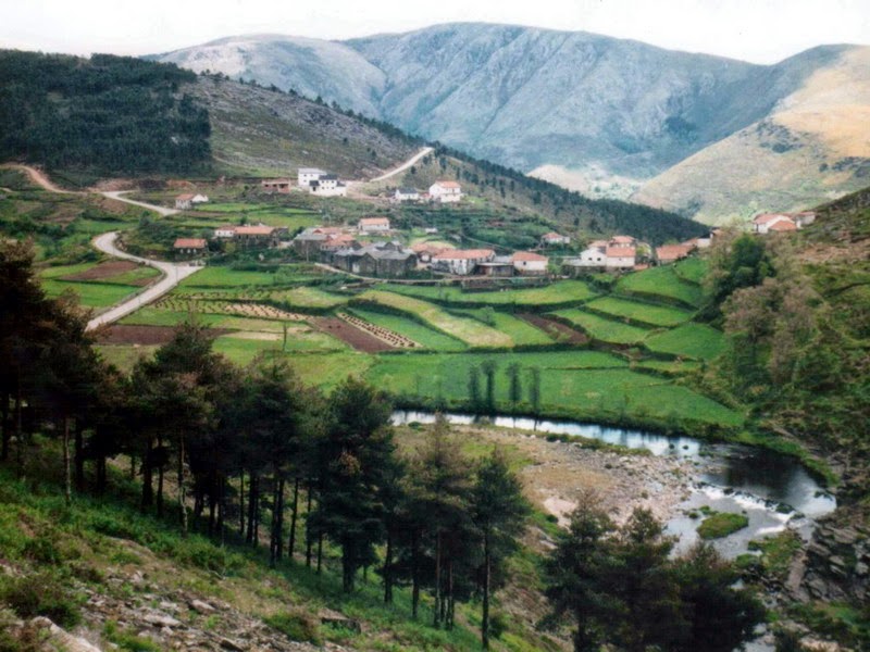 A aldeia de Varzigueto, que fica a montante da cascata. O rio que se vê em primeiro plano é o Olo, antes de se despenhar no abismo. A estrada que passa por esta aldeia conduz a uma outra aldeia, chamada Barreiro, que foi talvez ao longo dos séculos a mais recôndita de todo o Alvão, mas que, agora, tem estrada, eletricidade, telecomunicações, rede de água, saneamento, transporte público, etc. Também já teve escola, que deve ter sido encerrada (Foto de autor desconhecido)