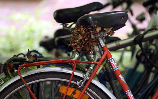 | Terceiro prémio. Uma carriça macho resolveu fazer o ninho debaixo do selim de uma bicicleta, no parque de estacionamento da universidade. (Foto: Raf Aerts, Universidade de Lovaina, Bélgica) |