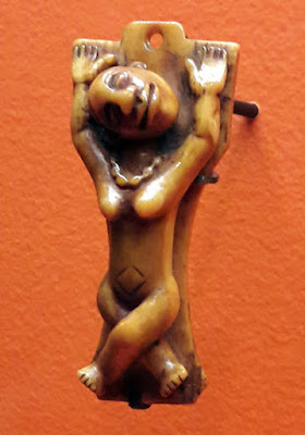No primeiro instante em que virmos esta pequena escultura de marfim, julgaremos estar em presença de uma imagem de Cristo crucificado. Só a seguir notaremos que esta figura tem formas femininas e até um colar no pescoço! «O que é isto?! Um Cristo feminino?!», espantar-nos-emos, «Que figura é esta, afinal?» Isto é um pequeno pingente de marfim, feito para ser trazido ao peito como uma medalha, datado do séc. XVIII e proveniente do reino do Congo, ao que tudo indica no que é hoje Angola. Pertence a uma coleção privada.